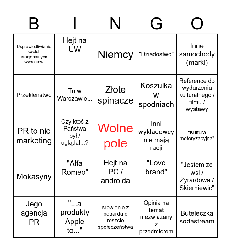 This bingo card has a free space and 24 words: "Alfa Romeo", "...a produkty Apple to...", Złote spinacze, Jego agencja PR, Inne samochody (marki), Usprawiedliwianie swoich irracjonalnych wydatków, Przekleństwo, Hejt na UW, Inni wykładowcy nie mają racji, Hejt na PC / androida, Koszulka w spodniach, PR to nie marketing, "Love brand", "Jestem ze wsi / Żyrardowa / Skierniewic", Tu w Warszawie..., Opinia na temat niezwiązany z przedmiotem, "Kultura motoryzacyjna", Niemcy, Reference do wydarzenia kulturalnego / filmu / wystawy, Czy ktoś z Państwa był / oglądał...?, Buteleczka sodastream, Mokasyny, "Dziadostwo" and Mówienie z pogardą o reszcie społeczeństwa.