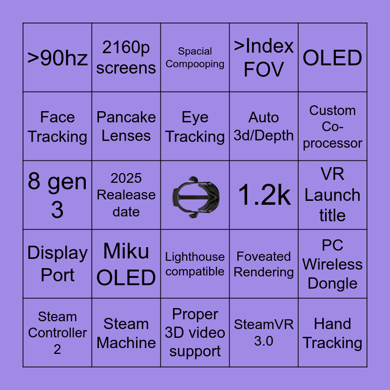 This bingo card has a free space and 24 words: Miku OLED, Steam Machine, Eye Tracking, Steam Controller 2, OLED, >90hz, Face Tracking, 2160p screens, 1.2k, Lighthouse compatible, Auto 3d/Depth, 8 gen 3, Foveated Rendering, PC Wireless Dongle, Pancake Lenses, SteamVR 3.0, VR Launch title, Spacial Compooping, Custom Co-processor, 2025 Realease date, Hand Tracking, Display Port, >Index FOV and Proper 3D video support.