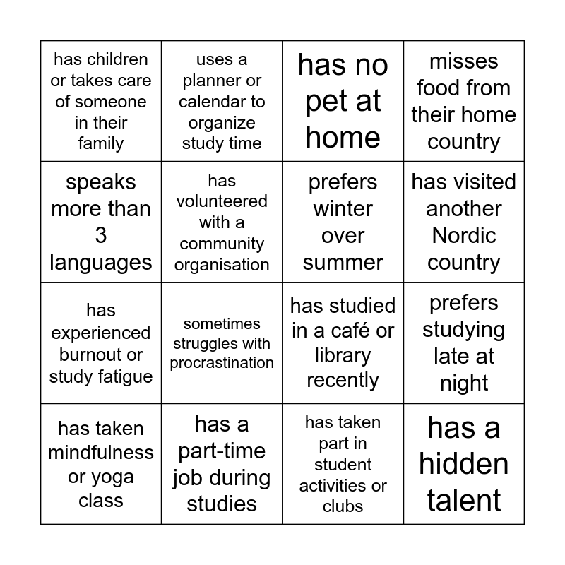This bingo card has 16 words: has a part-time job during studies, prefers studying late at night, has no pet at home, has children or takes care of someone in their family, has experienced burnout or study fatigue, uses a planner or calendar to organize study time, has studied in a café or library recently, has taken part in student activities or clubs, speaks more than 3 languages, has volunteered with a community organisation, has taken mindfulness or yoga class, misses food from their home country, sometimes struggles with procrastination, has visited another Nordic country, prefers winter over summer and has a hidden talent.