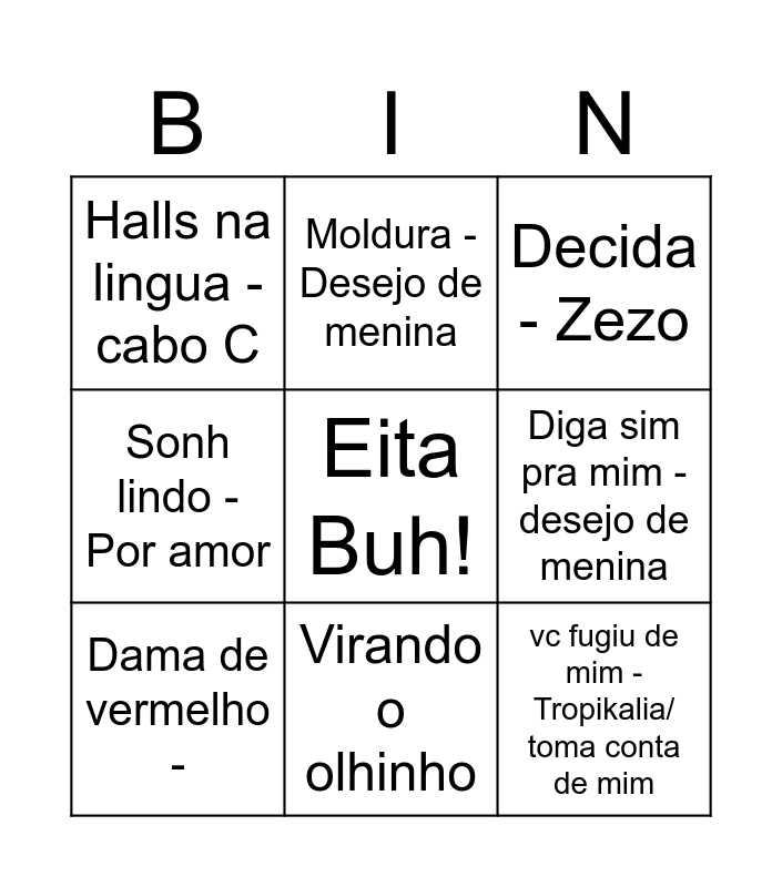 This bingo card has a free space and 8 words: Diga sim pra mim - desejo de menina, Decida - Zezo, Moldura - Desejo de menina, Dama de vermelho -, Halls na lingua - cabo C, vc fugiu de mim - Tropikalia/ toma conta de mim, Sonh lindo - Por amor and Virando o olhinho.