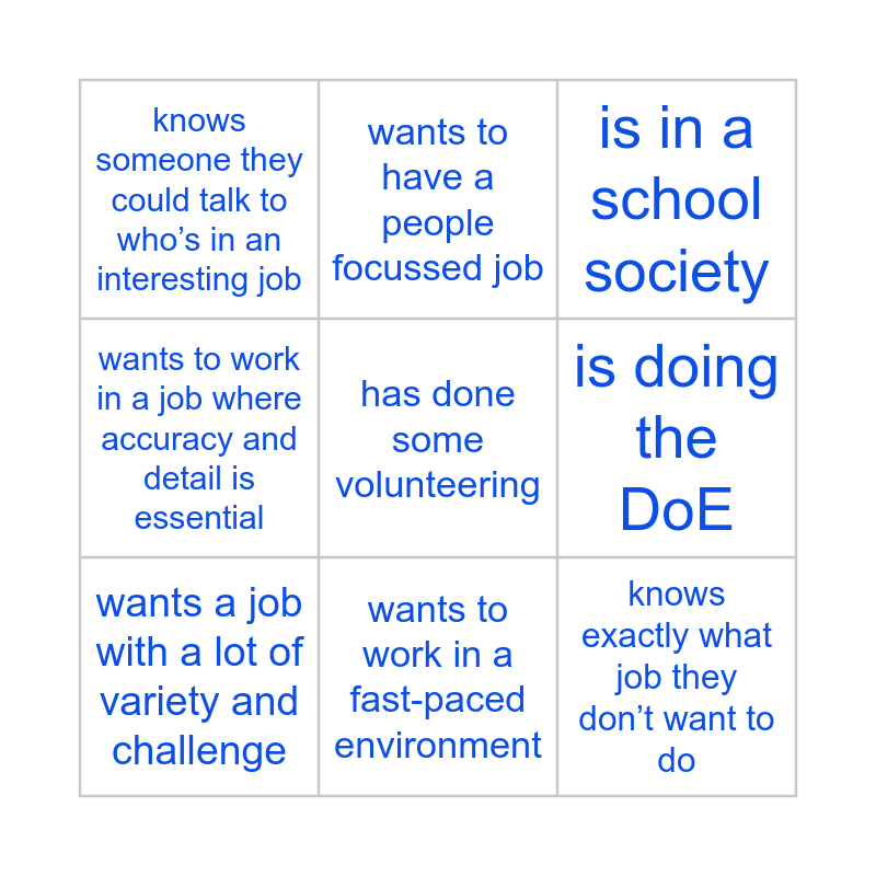 This bingo card has 12 words: knows exactly what job they want to do, knows exactly what job they don’t want to do, has done some volunteering, is doing the DoE, wants to have a people focussed job, is in a school society, wants to work in a fast-paced environment, wants a job where they can use their imagination and creativity, knows someone they could talk to who’s in an interesting job, wants to work in a job where accuracy and detail is essential, wants a job with a lot of variety and challenge and is already running their own small business.