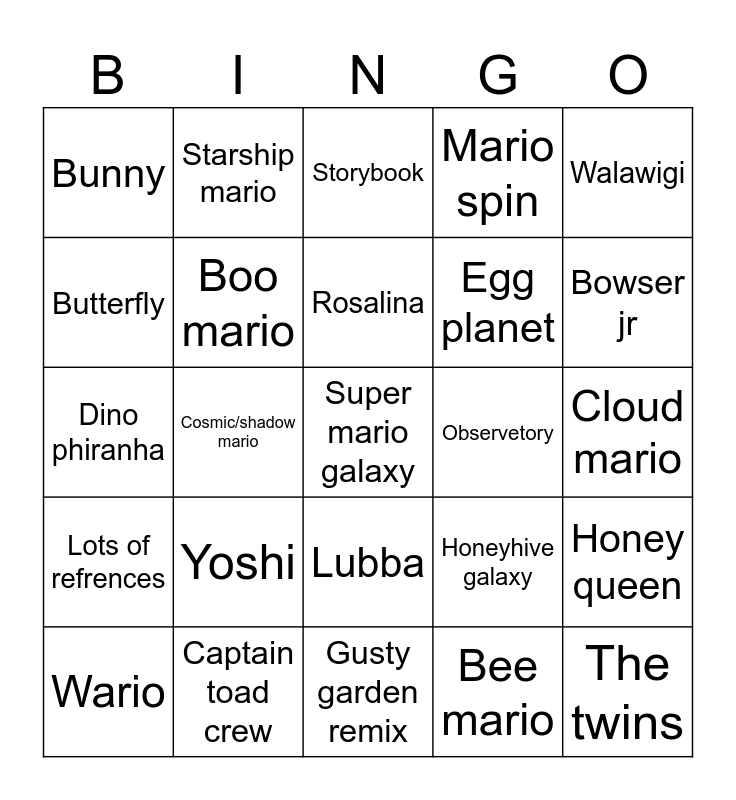 This bingo card has a free space and 24 words: Yoshi, Captain toad crew, Rosalina, Wario, Walawigi, Bunny, Butterfly, Starship mario, Observetory, Lubba, Egg planet, Dino phiranha, Honeyhive galaxy, Honey queen, Boo mario, Bee mario, Cloud mario, Storybook, Bowser jr, Cosmic/shadow mario, The twins, Lots of refrences, Mario spin and Gusty garden remix.
