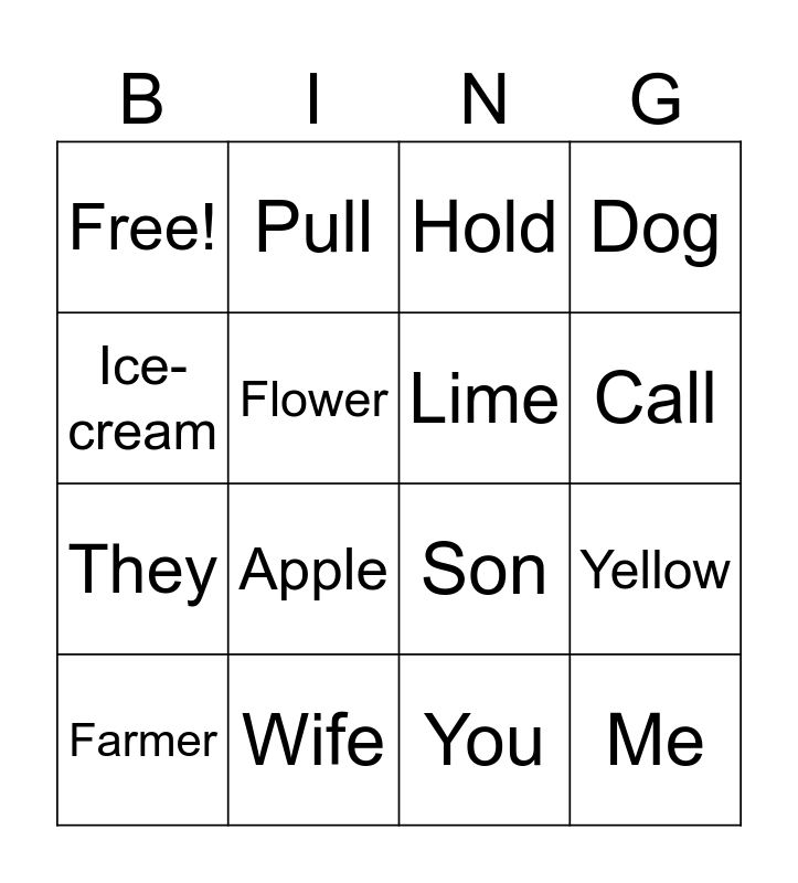 This bingo card has 16 words: Farmer, Wife, Hold, Dog, Ice-cream, Pull, Son, Yellow, Free!, Flower, You, Call, They, Apple, Lime and Me.