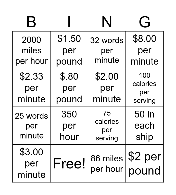 This bingo card has 25 words: 91 miles per hour, 50 word per minute, 100 calories per serving, 5 in each row, $2.33 per minute, 2000 miles per hour, $.80 per pound, $1.50 per pound, Free!, 80 miles per hour, 25 words per minute, 75 calories per serving, 60 in each row, 3 in each car, $2.00 per minute, 600 miles per hour, 86 miles per hour, 32 words per minute, 350 per hour, 50 in each ship, $3.00 per minute, 625 miles per hour, $2 per pound, $8.00 per minute and 200 per hour.