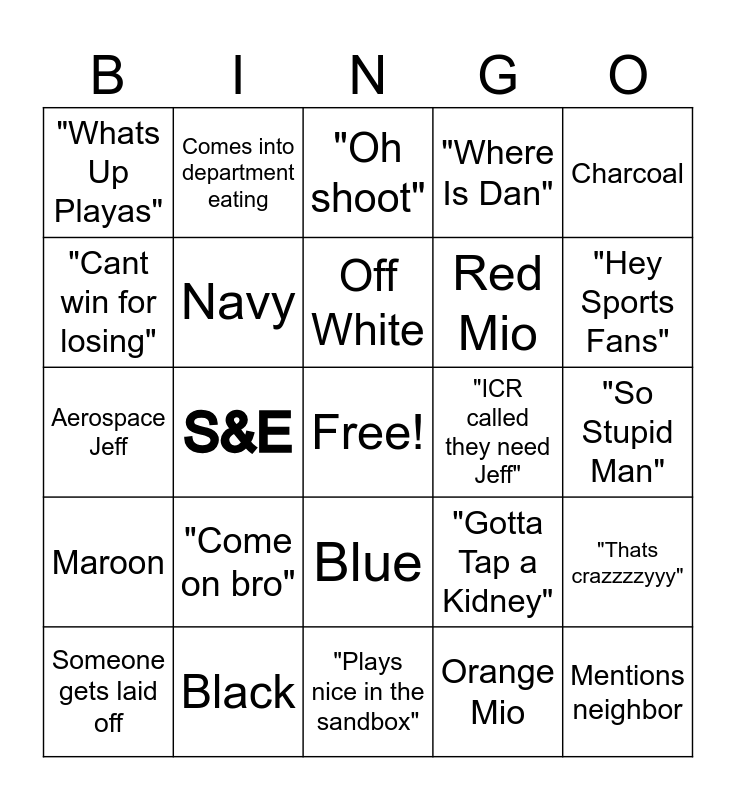 This bingo card has 40 words: Carpenter Jeff, Aerospace Jeff, Programmer Jeff, Navy, Black, Blue, Off White, Gray, Charcoal, Maroon, S&E, "Where Is Dan", Free!, "So Stupid Man", "ICR called they need Jeff", "Come on bro", Shade of Green, "Whats Up Playas", "Mentions Donuts", "Oh shoot", "Thats crazzzzyyy", Orange Mio, Red Mio, "Cant win for losing", "Ten Miles of bad road", "Hold this & ill get back to you", Better Made Chips, Eats Lean Cuisine, Mentions neighbor, Mentions Stomach Issues, Mentions family member issue, Someone gets laid off, "This that or the other", "Gotta Tap a Kidney", "Hey Sports Fans", "Plays nice in the sandbox", "Mentions Sausage neighbor", Jeff On a Bridgeport, Comes into department eating and "Just keeps getting better".
