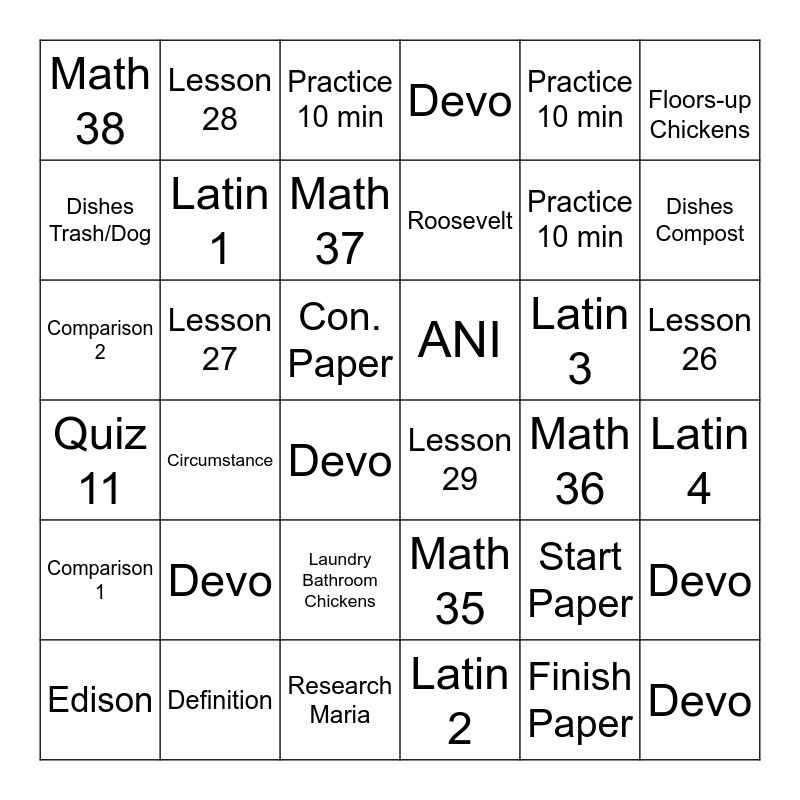 This bingo card has 36 words: Math 35, Laundry Bathroom Chickens, Latin 2, Dishes Trash/Dog, Quiz 11, ANI, Latin 1, Research Maria, Practice 10 min, Start Paper, Dishes Compost, Devo, Devo, Lesson 27, Roosevelt, Math 38, Comparison 1, Latin 3, Comparison 2, Practice 10 min, Con. Paper, Circumstance, Lesson 29, Devo, Math 36, Lesson 28, Practice 10 min, Definition, Math 37, Floors-up Chickens, Devo, Edison, Latin 4, Lesson 26, Devo and Finish Paper.