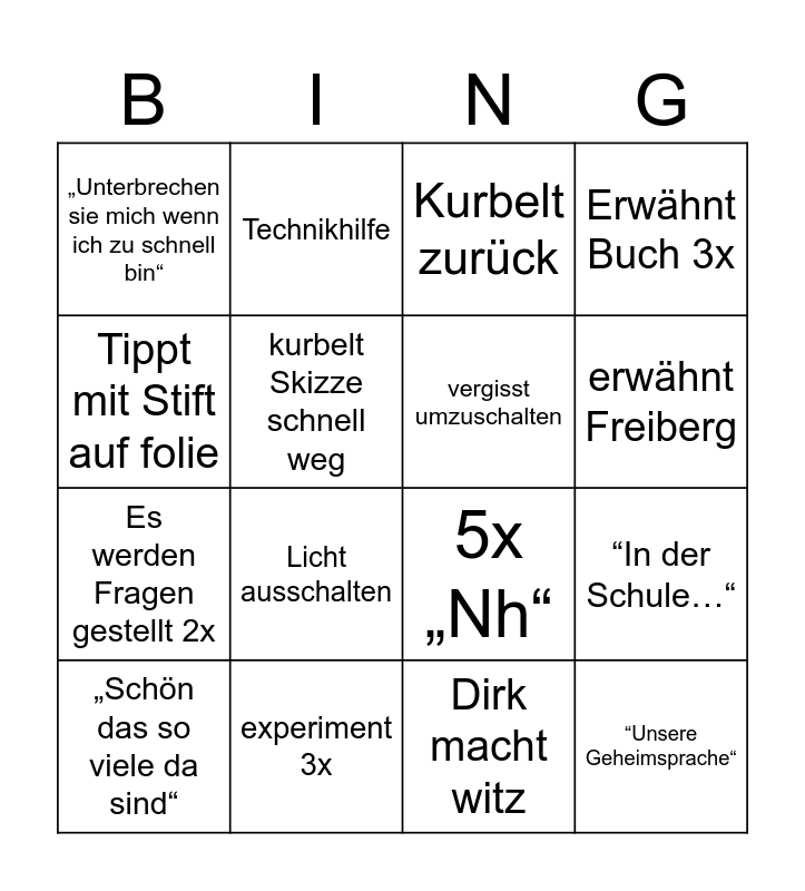 This bingo card has 16 words: experiment 3x, “In der Schule…“, Kurbelt zurück, „Unterbrechen sie mich wenn ich zu schnell bin“, Es werden Fragen gestellt 2x, Technikhilfe, 5x „Nh“, Dirk macht witz, Tippt mit Stift auf folie, kurbelt Skizze schnell weg, „Schön das so viele da sind“, Erwähnt Buch 3x, Licht ausschalten, erwähnt Freiberg, vergisst umzuschalten and “Unsere Geheimsprache“.