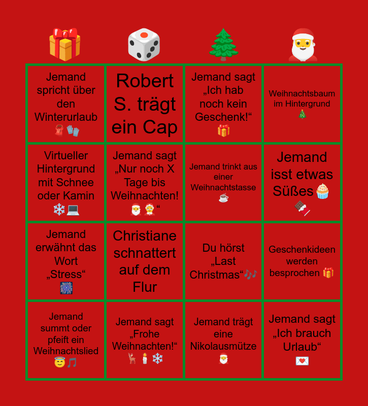 This bingo card has 40 words: Jemand trägt einen Weihnachtspulli 🎅☃️, Du hörst „Last Christmas“🎶, Jemand bringt Plätzchen mit 🍪, Jemand trinkt aus einer Weihnachtstasse ☕, Jemand sagt „Ich bin noch nicht in Weihnachtsstimmung“ 🎁✨🎅, Der Weihnachtsmarkt ist im Gespräch 🌟, Jemand isst etwas Süßes🧁🍫, Es wird über Glühwein gesprochen ☕🍷, Virtueller Hintergrund mit Schnee oder Kamin ❄️💻, Jemand sagt „Ich brauch Urlaub“ 💌, Geschenkideen werden besprochen 🎁, Weihnachtsbaum im Hintergrund 🎄, Jemand summt oder pfeift ein Weihnachtslied😇🎵, Jemand trägt eine Nikolausmütze 🎅, Jemand sagt „Frohe Weihnachten!“ 🦌🕯️❄️, Diskussion über echte vs. künstliche Bäume 🎄, Lichterkette im Teams sichtbar 💫, Jemand spricht über den Winterurlaub 🧣🧤, Jemand erwähnt Schnee ❄️☃️, Jemand sagt „Ich hab noch kein Geschenk!“ 🎁, Weihnachtliche Musik im Hintergrund 🌟🎶, Jemand spricht über Schokolade 🍫, Jemand erwähnt das Wort „Stress“ 🎆, Jemand sagt „Nur noch X Tage bis Weihnachten! 🎅🤶“, Jemand trägt Rot oder Grün 💚❤️, Eine E-Mail mit Weihnachtsgrüßen kommt rein 🐧, Jemand erwähnt Lebkuchen🧁🥧, Irgendein Weihnachtsfilm wird genannt 💌, Jemand fragt: „Wann ist nochmal die Weihnachtsfeier?“ 🎀, Jemand sagt „Ich liebe den Geruch von Zimt“ 💖, Andi geht mit seiner Kaffeetasse durch das Büro, Hanna fragt Julia: "Ist dir auch kalt?", Stefan verpasst ein Meeting, Dirk kommt mit Betty, Christiane schnattert auf dem Flur, Sophie geht in die Produktion etwas wegschmeißen, Daniel hat Kopfhörer auf, Robert O. kommt nach 12 Uhr, Robert S. trägt ein Cap and Stefan sagt "sozusagen".