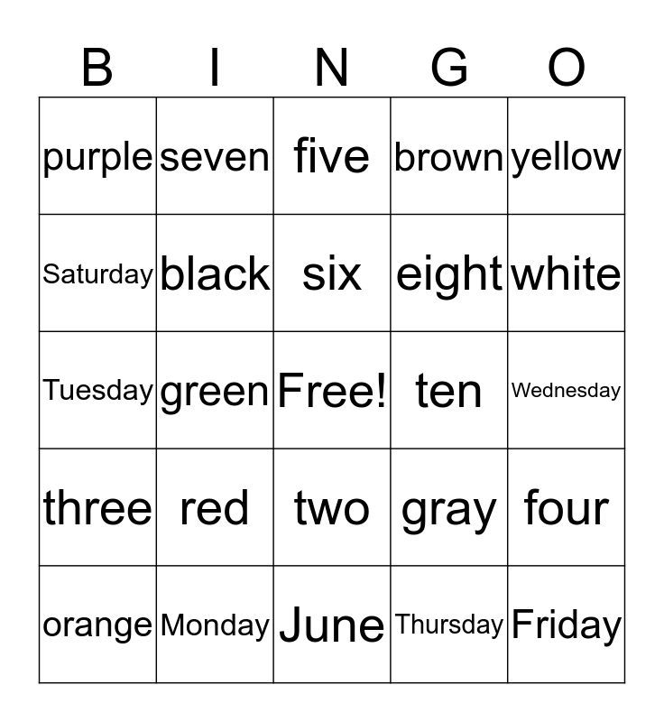 This bingo card has a free space and 24 words: red, Monday, six, orange, yellow, purple, Saturday, seven, ten, two, eight, Tuesday, gray, four, black, Thursday, Wednesday, five, white, green, Friday, three, brown and June.