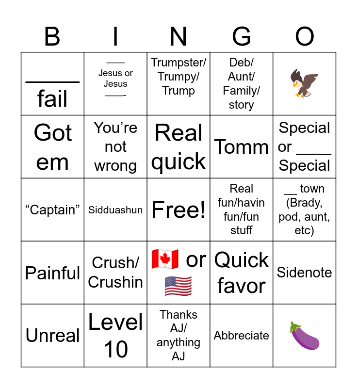 This bingo card has a free space and 24 words: Unreal, Crush/ Crushin, Real quick, Abbreciate, π¦ , ____ fail, ββ Jesus or Jesus ββ-, Trumpster/ Trumpy/ Trump, Real fun/havin fun/fun stuff, __ town (Brady, pod, aunt, etc), βCaptainβ, Youβre not wrong, Quick favor, Sidenote, Got em, Level 10, Thanks AJ/ anything AJ, Deb/ Aunt/ Family/ story, Special or ____ Special, Painful, Sidduashun, π¨π¦ or πΊπΈ, Tomm and π.