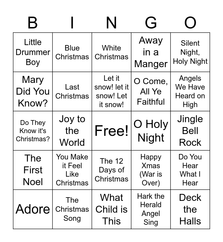 This bingo card has a free space and 24 words: You Make it Feel Like Christmas, The Christmas Song, Let it snow! let it snow! Let it snow!, Adore, Silent Night, Holy Night, Little Drummer Boy, Mary Did You Know?, Blue Christmas, O Holy Night, The 12 Days of Christmas, O Come, All Ye Faithful, Do They Know it's Christmas?, Happy Xmas (War is Over), Do You Hear What I Hear, Last Christmas, Hark the Herald Angel Sing, Jingle Bell Rock, White Christmas, Angels We Have Heard on High, Joy to the World, Deck the Halls, The First Noel, Away in a Manger and What Child is This.