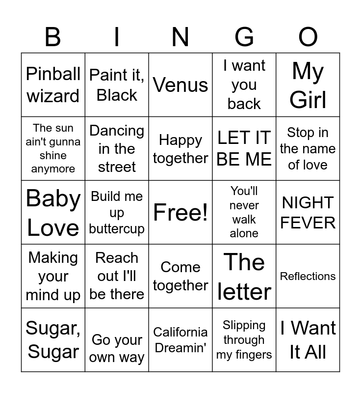 This bingo card has a free space and 39 words: Don’t Stop Believin’, Wonderwall, Tragedy, Dancing in the street, Sugar, Sugar, Come together, Happy together, Bridge over troubled water, My Girl, Making your mind up, Build me up buttercup, I want you back, I Want It All, NIGHT FEVER, You'll never walk alone, Reach out I'll be there, CATHY’S CLOWN, Pinball wizard, Should I stay or should I go?, The letter, The sun ain't gunna shine anymore, California Dreamin', LET IT BE ME, Stop in the name of love, You can't hurry love, The winner takes it all, Chiquitita, Waterloo, Sunny afternoon, Paint it, Black, I'm a Believer, A Horse with no name, Venus, Go your own way, Slipping through my fingers, I can't help myself (Sugar pie, Honey), Reflections, Baby Love and ABC.
