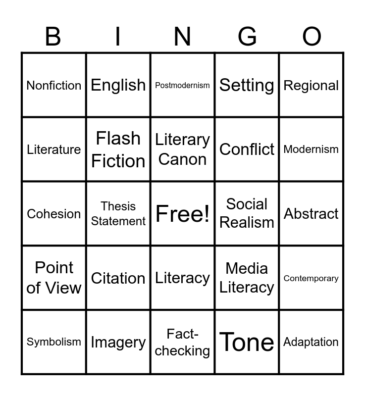 This bingo card has a free space and 59 words: Creative Writing, Imagery, Persona, Point of View, Tone, Theme, Flash Fiction, Dialogue, Conflict, Plot, Setting, 21st Century, Literature, Intertextuality, Hypertext, Nonfiction, Adaptation, Regional, Oral Tradition, Literary Canon, Social Realism, Postmodernism, Symbolism, Contemporary, Installation Art, Mixed Media, Indigenous Art, Performance Art, Modernism, Collage, Abstract, Folk Art, Contemporary, Sculpture, English, Academic, Professional, Thesis Statement, Coherence, Cohesion, Paraphrase, Citation, Abstract, Academic Writing, Formal Language, Research, Concept Paper, Media, Literacy, Fact-checking, Credibility, Digital Divide, Propaganda, Algorithm, Cyberbullying, Media Literacy, Information Overload, Source Evaluation and Freedom of Expression.