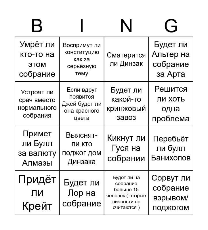 This bingo card has 16 words: Будет ли Лор на собрание, Перебьёт ли булл Банихопов, Сматерится ли Динзак, Умрёт ли кто-то на этом собрание, Примет ли Булл за валюту Алмазы, Воспримут ли конституцию как за серьёзную тему, Кикнут ли Гуся на собрании, Будет ли на собрание больше 15 человек ( вторые личности не считаются ), Устроят ли срач вместо нормального собрания, Если вдруг появится Джей будет ли она красного цвета, Придёт ли Крейт, Будет ли Альтер на собрание за Арта, Выяснят-ли кто поджог дом Динзака, Решится ли хоть одна проблема, Будет ли какой-то кринжовый завоз and Сорвут ли собрание взрывом/поджогом.