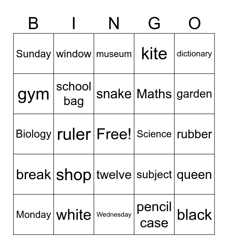 This bingo card has a free space and 29 words: Monday, eight, ruler, green, Sunday, museum, school bag, shop, Science, white, rubber, black, Wednesday, pencil case, garden, English, twelve, break, dictionary, Biology, subject, yellow, Maths, gym, kite, window, queen, snake and yacht.