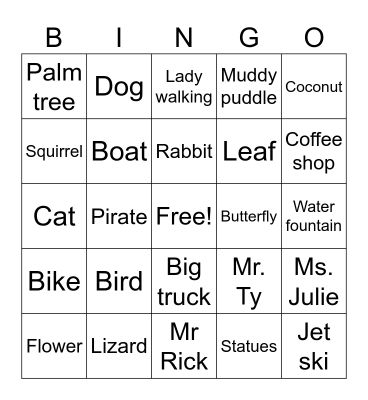 This bingo card has a free space and 24 words: Bird, Lizard, Rabbit, Flower, Coconut, Palm tree, Squirrel, Dog, Butterfly, Big truck, Leaf, Cat, Mr. Ty, Ms. Julie, Boat, Statues, Water fountain, Lady walking, Coffee shop, Pirate, Jet ski, Bike, Muddy puddle and Mr Rick.