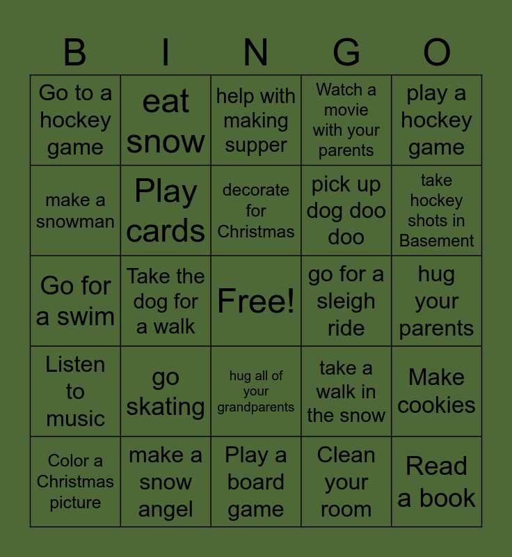 This bingo card has a free space and 24 words: go skating, make a snow angel, decorate for Christmas, Color a Christmas picture, play a hockey game, Go to a hockey game, make a snowman, eat snow, go for a sleigh ride, hug all of your grandparents, pick up dog doo doo, Go for a swim, take a walk in the snow, Make cookies, Play cards, Clean your room, hug your parents, help with making supper, take hockey shots in Basement, Take the dog for a walk, Read a book, Listen to music, Watch a movie with your parents and Play a board game.