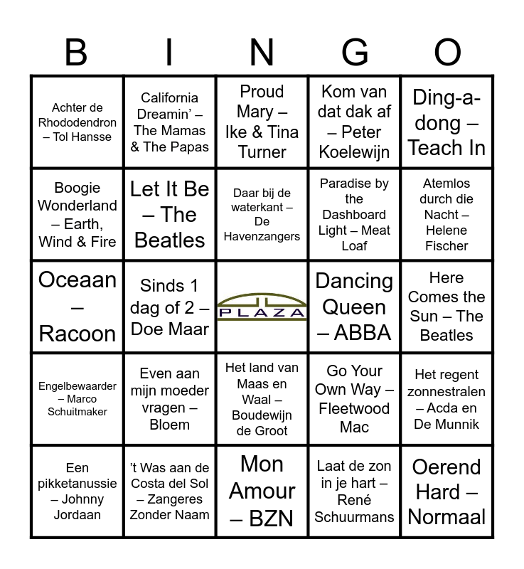 This bingo card has a free space and 25 words: Even aan mijn moeder vragen – Bloem, Mon Amour – BZN, Daar bij de waterkant – De Havenzangers, Een pikketanussie – Johnny Jordaan, Ding-a-dong – Teach In, Achter de Rhododendron – Tol Hansse, Boogie Wonderland – Earth, Wind & Fire, California Dreamin’ – The Mamas & The Papas, Dancing Queen – ABBA, Het land van Maas en Waal – Boudewijn de Groot, Paradise by the Dashboard Light – Meat Loaf, Oceaan – Racoon, Go Your Own Way – Fleetwood Mac, Het regent zonnestralen – Acda en De Munnik, Let It Be – The Beatles, Another Brick in the Wall – Pink Floyd, Here Comes the Sun – The Beatles, Proud Mary – Ike & Tina Turner, Atemlos durch die Nacht – Helene Fischer, Sinds 1 dag of 2 – Doe Maar, Oerend Hard – Normaal, ’t Was aan de Costa del Sol – Zangeres Zonder Naam, Engelbewaarder – Marco Schuitmaker, Kom van dat dak af – Peter Koelewijn and Laat de zon in je hart – René Schuurmans.