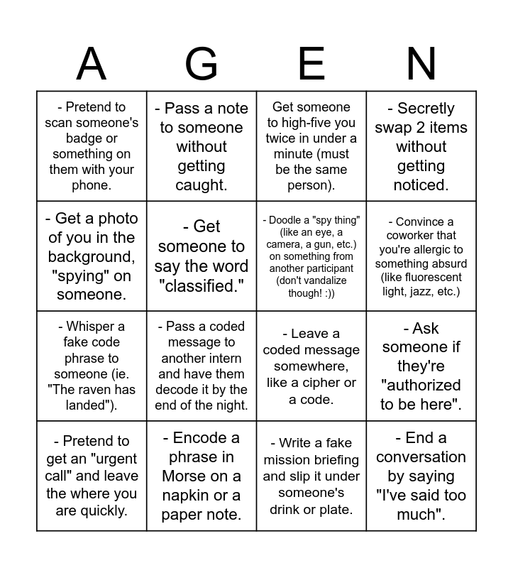 This bingo card has 77 words: Convince someone to tell you a secret (of any kind)., Get someone to call you by a fake codename (of your choosing)., Get someone to high-five you twice in under a minute (must be the same person)., Convince a coworker that you're allergic to something absurd (like fluorescent light, jazz, etc.), Get someone to say the word "classified.", Mention "MI6? in a conversation naturally., Ask someone if they're "authorized to be here"., Get someone to hand you a random object without them realizing that it's for the bingo (be original pls, not a drink, a napkin or something like that)., Free!, - Convince someone to tell you a secret (of any kind)., - Get someone to call you by a fake codename (of your choosing)., - Get someone to high-five you twice in under a minute (must be the same person)., - Convince a coworker that you're allergic to something absurd (like fluorescent light, jazz, etc.), - Get someone to say the word "classified.", - Mention "MI6? in a conversation naturally., - Ask someone if they're "authorized to be here"., - Get someone to hand you a random object without them realizing that it's for the bingo (be original pls, not a drink, a napkin or something like that)., - Pretend to get an "urgent call" and leave the where you are quickly., - Follow someone discreetly for 30s without them noticing., - Get a photo of you in the background, "spying" on someone., - Hide a sticky note labeled with "TOP SECRET" somewhere visible and take a picture of it., - Leave a coded message somewhere, like a cipher or a code., - Doodle a "spy thing" (like an eye, a camera, a gun, etc.) on something from another participant (don't vandalize though! :)), - Pass a note to someone without getting caught., - Secretly swap 2 items without getting noticed., - Use a fake accent for at least 30s in a conversation., - Pretend to be from another department., - Wear sunglasses indoors for five minutes without explanation., - Introduce to someone you know using a different name., - Pretend to have an accomplice and reference them casually ("My handler says it's fine"), - Hide behind an object or a wall for at least 10 seconds for no reason, and have someone take you in picture., - Trade an accessory or clothing item with another intern., - Exit the room, add a piece of disguise (jacket, hat, scarf, glasses), and re-enter un-noticed., - Pretend to be another employee for a conversation., - Pass a coded message to another intern and have them decode it by the end of the night., - Whisper a fake code phrase to someone (ie. "The raven has landed")., - Teach someone a fake spy signal and use it during the night., - Create and use a secret handshake with another intern., - Write a fake mission briefing and slip it under someone's drink or plate., - Deliver a message to a random person that sounds important but that's complete non-sense., - Get someone to agree to "Join your mission"., - Use spy jargon while on conversation with someone (like "Copy that, agent", "proceeding to extraction point", "I'm compromised, going low"), - Plant a fake "list of suspects" somewhere., - Get someone to pose like a spy for a photo., - Offer someone a "classified" drink (a mystery cocktail or a soda)., - Convince someone to "secure the perimeter" with you., - "Deactivate" something (like a lamp or a speaker) and announce "mission accomplished" (someone must hear you say it)., - Pretend to scan someone's badge or something on them with your phone., - Exchange a nod with another playing intern., - Create a fake mission report of an event that just happened., - Pretend to report the action of someone close to you, like a secret agent (talk loud enough that they can hear you, but not too loud.), - Convince somebody that you've already met before., - Ask a manager an oddly specific question about "protocols"., - Convince someone that you are part of the planning committee for the event., - Get someone to whisper with you for no reason., - Convince someone to salute you., - Get two people to shake hands on false pretenses., - Map the room venue layout on a piece of paper or napkin with labels like "Entry point A", "Escape route", "Target", etc., - Stand perfectly still behind a plant for at least 30s without any reason., - Get yourself in a photo by photobombing it, you must appear in a reflection and not be the main subject of the photo., - Talk to your wrist mid-conversation, as if you were talking to someone on a radio., - Get someone to ask "Are you okay?" because of your weird behavior., - Pretend that you're following someone's orders via an earpiece., - Test someone's drink for poison, by taking a sip of it., - Slip a piece of paper into your pocket dramatically after reading it., - Pretend to search the room with a flashlight app like you're on a patrol., - Deliver a message entirely in acronyms., - Encode a phrase in Morse on a napkin or a paper note., - Teach someone a fake "spy language" word and use it later., - Refer to a random location as "HQ"., - Leave a mysterious sticky note that says something like "Meet at 2300, location 2"., - Start a rumor that there's a double agent among the interns., - End a conversation by saying "I've said too much"., - Convince someone to help you "guard" something meaningless for 30s, as if it was in immediate danger., - Deliver something discreetly to someone using only one hand, while keeping the other in your pocket., - Pretend to sweep your glass or table like you're wiping your fingerprints. and - Slip a note under a closed door..