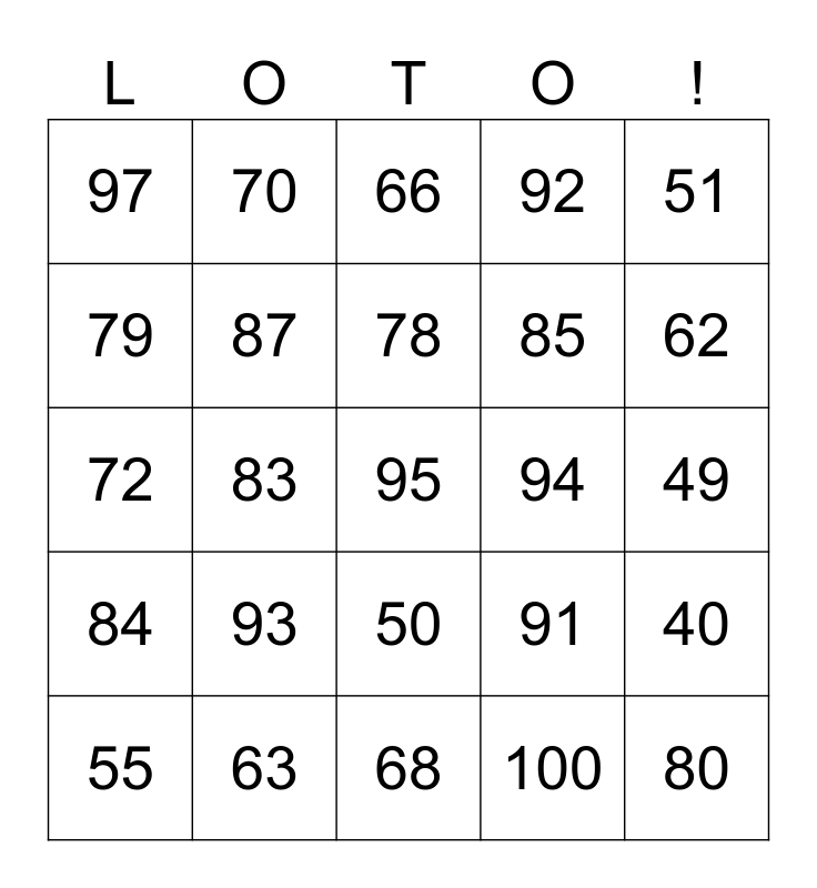 This bingo card has a free space and 29 words: 55, 76, 83, 61, 97, 66, 87, 93, 94, 63, 49, 80, 68, 100, 62, 48, 50, 84, 51, 72, 91, 59, 85, 79, 92, 70, 40, 78 and 42.