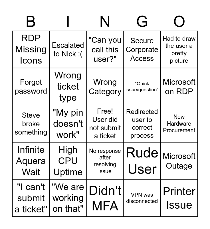 This bingo card has a free space and 24 words: High CPU Uptime, "We are working on that", Wrong Category, "I can't submit a ticket", Had to draw the user a pretty picture, RDP Missing Icons, Forgot password, Escalated to Nick :(, Redirected user to correct process, No response after resolving issue, "Quick issue/question", Steve broke something, Rude User, Microsoft Outage, Wrong ticket type, VPN was disconnected, New Hardware Procurement, "Can you call this user?", Microsoft on RDP, "My pin doesn't work", Printer Issue, Infinite Aquera Wait, Secure Corporate Access and Didn't MFA.
