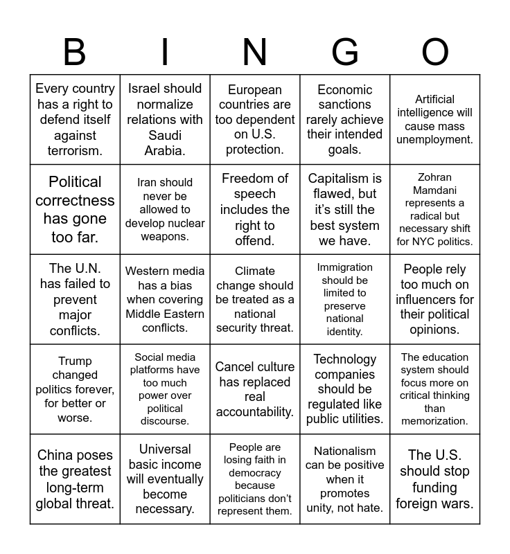 This bingo card has a free space and 24 words: Social media platforms have too much power over political discourse., Universal basic income will eventually become necessary., Freedom of speech includes the right to offend., China poses the greatest long-term global threat., Artificial intelligence will cause mass unemployment., Every country has a right to defend itself against terrorism., Political correctness has gone too far., Israel should normalize relations with Saudi Arabia., Immigration should be limited to preserve national identity., Cancel culture has replaced real accountability., Capitalism is flawed, but it’s still the best system we have., The U.N. has failed to prevent major conflicts., Technology companies should be regulated like public utilities., The education system should focus more on critical thinking than memorization., Iran should never be allowed to develop nuclear weapons., Nationalism can be positive when it promotes unity, not hate., People rely too much on influencers for their political opinions., European countries are too dependent on U.S. protection., Zohran Mamdani represents a radical but necessary shift for NYC politics., Western media has a bias when covering Middle Eastern conflicts., The U.S. should stop funding foreign wars., Trump changed politics forever, for better or worse., Economic sanctions rarely achieve their intended goals. and People are losing faith in democracy because politicians don’t represent them..