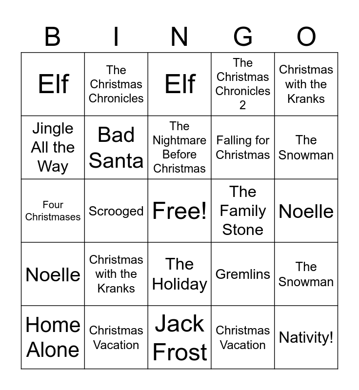 ⚠ This card has duplicate items: Home Alone (2), Elf (2), The Grinch (2), The Polar Express (2), Love Actually (2), The Holiday (2), The Santa Clause (2), Miracle on 34th Street (2), The Nightmare Before Christmas (2), Jingle All the Way (2), The Muppet Christmas Carol (2), Scrooged (2), Klaus (2), Nativity! (2), Christmas with the Kranks (2), Deck the Halls (2), Bad Santa (2), The Christmas Chronicles (2), Fred Claus (2), Last Christmas (2), Office Christmas Party (2), The Family Stone (2), A Christmas Carol (2), Die Hard (2), Gremlins (2), The Snowman (2), Noelle (2), Christmas Vacation (2), The Princess Switch (2), Jack Frost (2), The Man Who Invented Christmas (2)