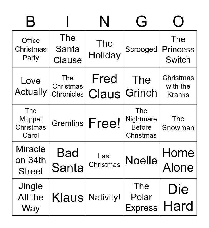 This bingo card has a free space and 28 words: Home Alone, Elf, The Grinch, The Polar Express, Love Actually, The Holiday, The Santa Clause, Miracle on 34th Street, The Nightmare Before Christmas, Jingle All the Way, The Muppet Christmas Carol, Scrooged, Klaus, Nativity!, Christmas with the Kranks, Deck the Halls, Bad Santa, The Christmas Chronicles, Fred Claus, Last Christmas, Office Christmas Party, A Christmas Carol, Die Hard, Gremlins, The Snowman, Noelle, The Princess Switch and Jack Frost.