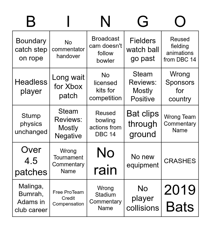 This bingo card has a free space and 35 words: Game leaks early, Bald licensed players, "Wait for the day one patch" - Ross, Long wait for Xbox patch, No rain, Fielders watch ball go past, Headless player, Ball clips through bat, No licensed kits for competition, Blank adboards, Stump physics unchanged, Reused fielding animations from DBC 14, Reused batting animations from DBC 14, No new audio, Boundary catch step on rope, Bat clips through ground, No player collisions, Steam Reviews: Mostly Negative, Over 4.5 patches, 2019 Bats, No new equipment, Malinga, Bumrah, Adams in club career, CRASHES, Free ProTeam Credit Compensation, Broadcast cam doesn't follow bowler, Wrong Sponsors for country, Scripted wickets, Steam Reviews: Mixed, Steam Reviews: Mostly Positive, Wrong Team Commentary Name, Wrong Player Commentary Name, Wrong Stadium Commentary Name, Wrong Tournament Commentary Name, No commentator handover and Academy issues.
