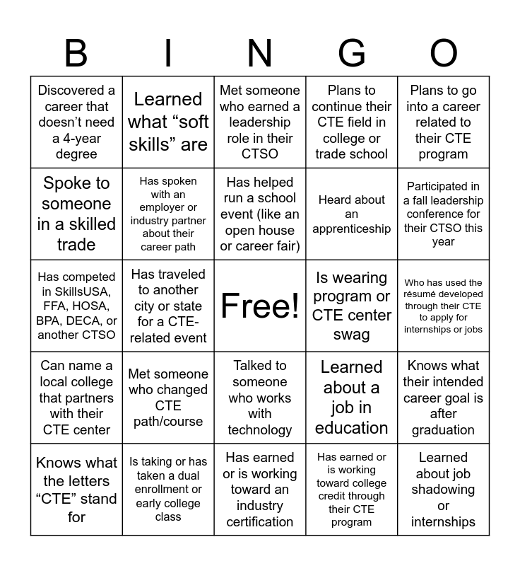 This bingo card has a free space and 25 words: Met someone who changed CTE path/course, Has earned or is working toward an industry certification, Has helped run a school event (like an open house or career fair), Knows what the letters “CTE” stand for, Plans to go into a career related to their CTE program, Discovered a career that doesn’t need a 4-year degree, Spoke to someone in a skilled trade, Learned what “soft skills” are, Is wearing program or CTE center swag, Talked to someone who works with technology, Heard about an apprenticeship, Has competed in SkillsUSA, FFA, HOSA, BPA, DECA, or another CTSO, Learned about a job in education, Knows what their intended career goal is after graduation, Has spoken with an employer or industry partner about their career path, Has worn PPE (personal protective equipment) in class, Who has used the résumé developed through their CTE to apply for internships or jobs, Met someone who earned a leadership role in their CTSO, Participated in a fall leadership conference for their CTSO this year, Has traveled to another city or state for a CTE-related event, Learned about job shadowing or internships, Is taking or has taken a dual enrollment or early college class, Can name a local college that partners with their CTE center, Plans to continue their CTE field in college or trade school and Has earned or is working toward college credit through their CTE program.