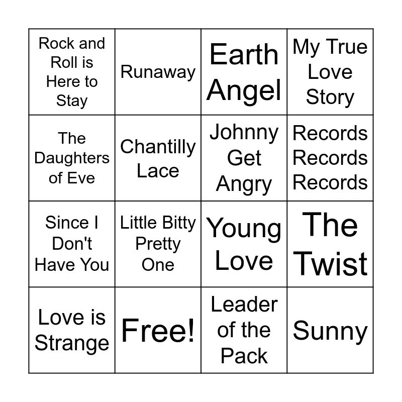 This bingo card has 27 words: Going to the Chapel, Little Darlin, Since I Don't Have You, I Wonder Why, Chantilly Lace, Earth Angel, Runaway, Sunny, Free!, Tonight Tonight, Young Love, My True Love Story, He's So Fine, All Shook Up, Little Bitty Pretty One, Whispering Bells, Johnny Get Angry, Records Records Records, At the Hop, Rock and Roll is Here to Stay, Leader of the Pack, Unique, The Twist, Love is Strange, I Want my Share, The Daughters of Eve and The Peppermint Twist.
