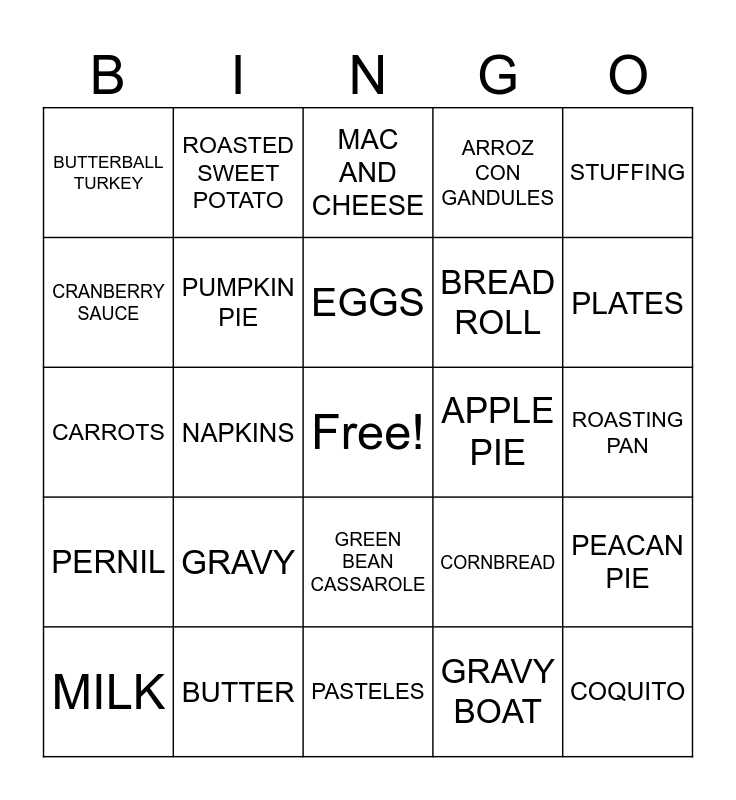 This bingo card has a free space and 24 words: GRAVY, BUTTER, EGGS, MILK, STUFFING, BUTTERBALL TURKEY, CRANBERRY SAUCE, ROASTED SWEET POTATO, APPLE PIE, GREEN BEAN CASSAROLE, BREAD ROLL, CARROTS, CORNBREAD, PEACAN PIE, PUMPKIN PIE, GRAVY BOAT, ROASTING PAN, MAC AND CHEESE, PLATES, NAPKINS, COQUITO, PERNIL, ARROZ CON GANDULES and PASTELES.