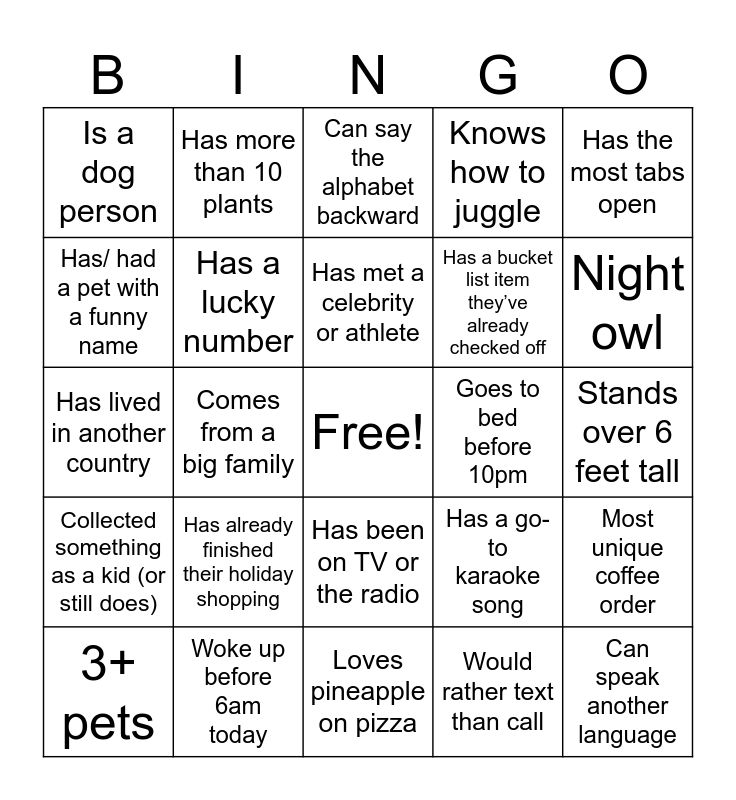 This bingo card has a free space and 35 words: Has worked at Rightway more than 5 years, Has a weird talent, Has a celebrity look-alike, Has a lucky number, Has been on TV or the radio, Knows how to juggle, Has/ had a pet with a funny name, Prefers winter over summer, Has met a celebrity or athlete, Has run a half or full marathon, Has lived in another country, Has the most tabs open, Has climbed a mountain, Has an unusual fear, Is a dog person, Goes to bed before 10pm, Would rather text than call, Comes from a big family, Collected something as a kid (or still does), Can speak another language, Has a go-to karaoke song, 3+ pets, Most unique coffee order, Woke up before 6am today, Can say the alphabet backward, Night owl, Prefers books over movies, Has more than 500 unread emails, Has a bucket list item they’ve already checked off, Stands over 6 feet tall, Has a tattoo, Loves pineapple on pizza, Has already finished their holiday shopping, Has more than 10 plants and Plays a musical instrument.