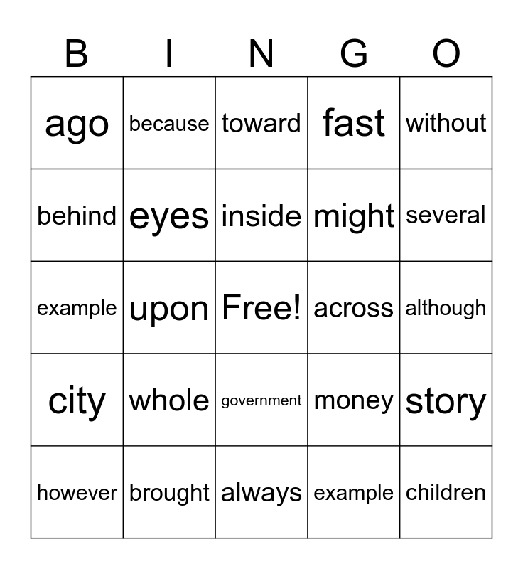 This bingo card has a free space and 33 words: course, much, upon, open, city, eyes, without, however, because, green, inside, toward, something, special, across, several, brought, example, whole, money, government, able, ago, although, always, children, fast, might, behind, story, energy, example and young.