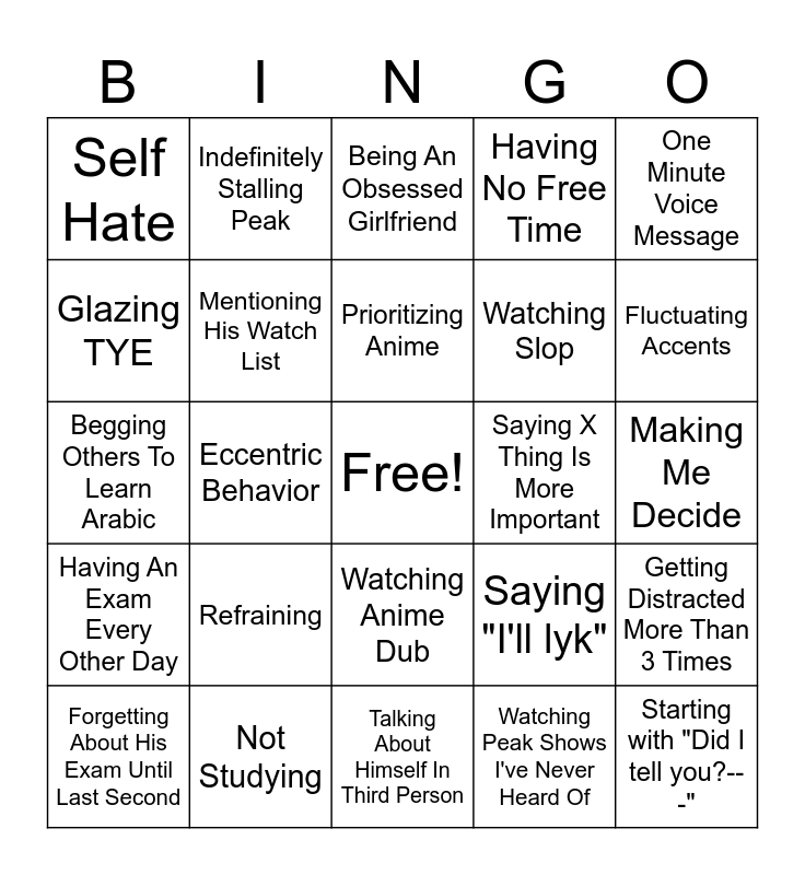 This bingo card has a free space and 24 words: Refraining, Not Studying, Prioritizing Anime, Forgetting About His Exam Until Last Second, One Minute Voice Message, Self Hate, Glazing TYE, Indefinitely Stalling Peak, Saying X Thing Is More Important, Watching Anime Dub, Watching Slop, Begging Others To Learn Arabic, Saying "I'll lyk", Getting Distracted More Than 3 Times, Mentioning His Watch List, Watching Peak Shows I've Never Heard Of, Making Me Decide, Being An Obsessed Girlfriend, Fluctuating Accents, Eccentric Behavior, Starting with "Did I tell you?---", Having An Exam Every Other Day, Having No Free Time and Talking About Himself In Third Person.