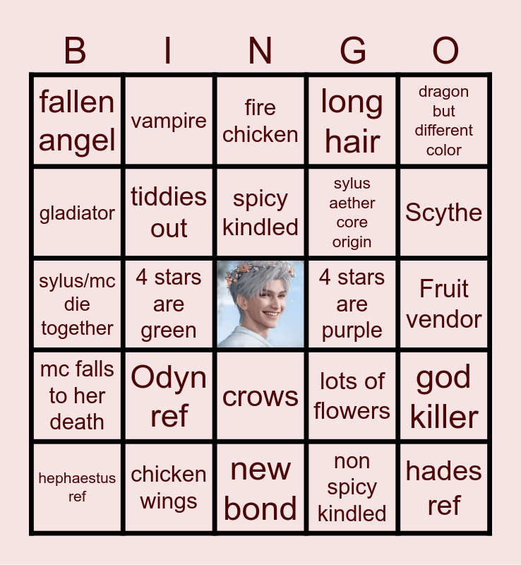 This bingo card has a free space and 24 words: Odyn ref, chicken wings, spicy kindled, hephaestus ref, dragon but different color, fallen angel, gladiator, vampire, 4 stars are purple, crows, sylus aether core origin, sylus/mc die together, lots of flowers, god killer, tiddies out, non spicy kindled, Fruit vendor, fire chicken, Scythe, 4 stars are green, hades ref, mc falls to her death, long hair and new bond.