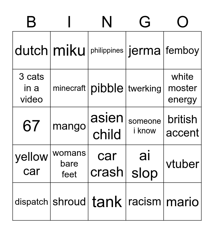 This bingo card has a free space and 24 words: womans bare feet, shroud, pibble, dispatch, femboy, dutch, 3 cats in a video, miku, someone i know, car crash, twerking, 67, ai slop, vtuber, minecraft, racism, british accent, philippines, white moster energy, mango, mario, yellow car, jerma and tank.