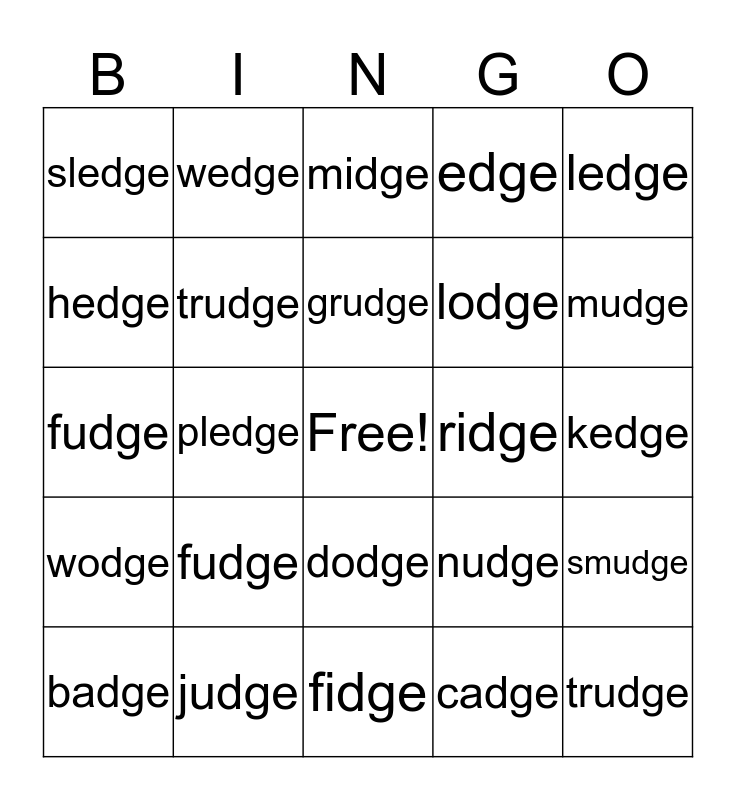 This bingo card has a free space and 24 words: fudge, judge, grudge, badge, ledge, sledge, hedge, wedge, ridge, dodge, lodge, fudge, nudge, smudge, trudge, cadge, kedge, midge, mudge, pledge, trudge, wodge, edge and fidge.