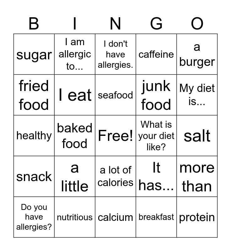 This bingo card has a free space and 34 words: What do you eat for...?, breakfast, lunch, dinner, snack, I eat, a burger, Do you have allergies?, I am allergic to..., peanuts, seafood, I don't have allergies., I have an intolerance., I have seasonal allergies., What is your diet like?, My diet is..., nutritious, healthy, a little, It has..., a lot of calories, fat/grease, sugar, salt, calcium, protein, caffeine, a lot of vitamins, junk food, fried food, grilled food, baked food, more than and less than.