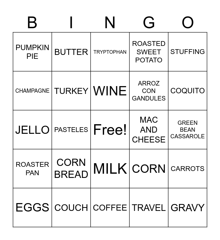 This bingo card has a free space and 39 words: FAMILY, CHAMPAGNE, PEACAN PIE, TURKEY, EGGS, MILK, WINE, MASHED POTATO, STUFFING, ROASTER PAN, PASTELES, ROASTED SWEET POTATO, GRAVY, GREEN BEAN CASSAROLE, MAC AND CHEESE, CORN BREAD, CRANBERRY SAUCE, PUMPKIN PIE, DINNER ROLLS, CORN, CHAMPAGNE, COFFEE, ARROZ CON GANDULES, COQUITO, POTLUCK, NAPKINS, FOOTBALL, DETROIT LIONS, DALLAS COWBOYS, BUTTER, SALT AND PEPPER, ADOBO, TRYPTOPHAN, COUCH, TRAVEL, CHARLIE BROWN, CARROTS, JELLO and FLAN.