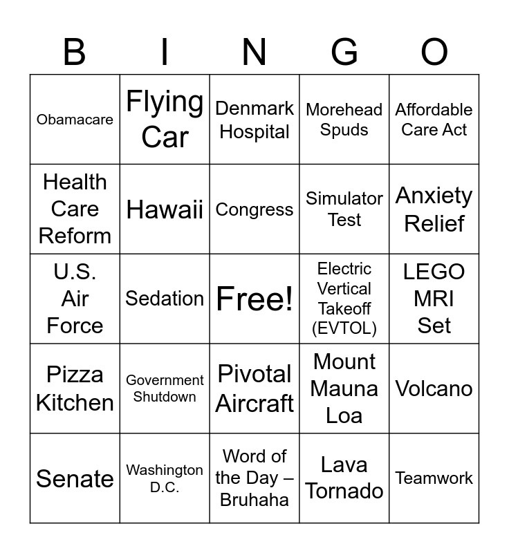 This bingo card has a free space and 24 words: Government Shutdown, Washington D.C., Congress, Senate, Affordable Care Act, Obamacare, Health Care Reform, Flying Car, Electric Vertical Takeoff (EVTOL), Pivotal Aircraft, Simulator Test, U.S. Air Force, Mount Mauna Loa, Volcano, Hawaii, Lava Tornado, LEGO MRI Set, Denmark Hospital, Anxiety Relief, Sedation, Teamwork, Pizza Kitchen, Morehead Spuds and Word of the Day – Bruhaha.