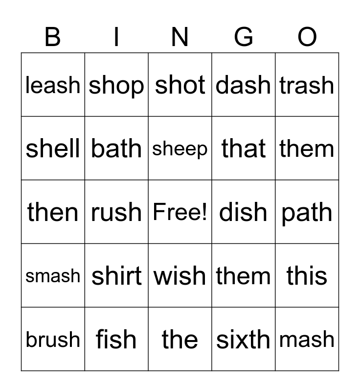 This bingo card has a free space and 24 words: shirt, fish, sheep, brush, trash, leash, shell, shop, dish, wish, that, then, them, this, bath, sixth, path, shot, them, rush, mash, smash, dash and the.