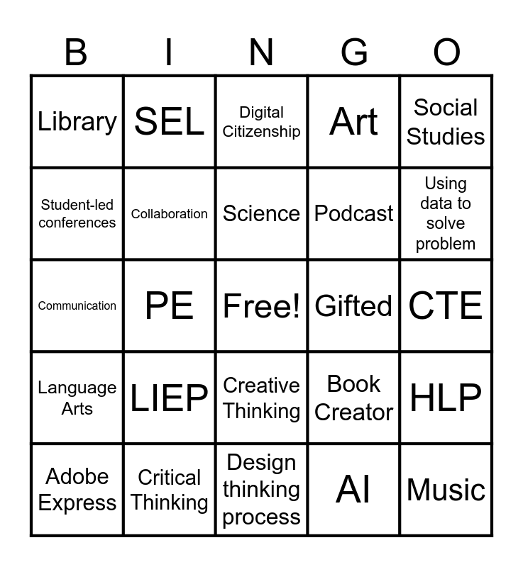 This bingo card has a free space and 40 words: Character, Communication, Citizenship, Collaboration, Critical Thinking, Creative Thinking, Science, Math, Social Studies, Language Arts, PE, Art, Music, CTE, Gifted, LIEP, Ex Ed, Library, Computer Science, Digital Citizenship, HLP, AI, Podcast, Student-led conferences, Presentation of Learning, LEGO, Ozobot, Sphero, Indi, Coding, Canva, Adobe Express, Google Workspace, Book Creator, Using data to solve problem, Design thinking process, STEAM, Community involvement, SEL and School Counseling.