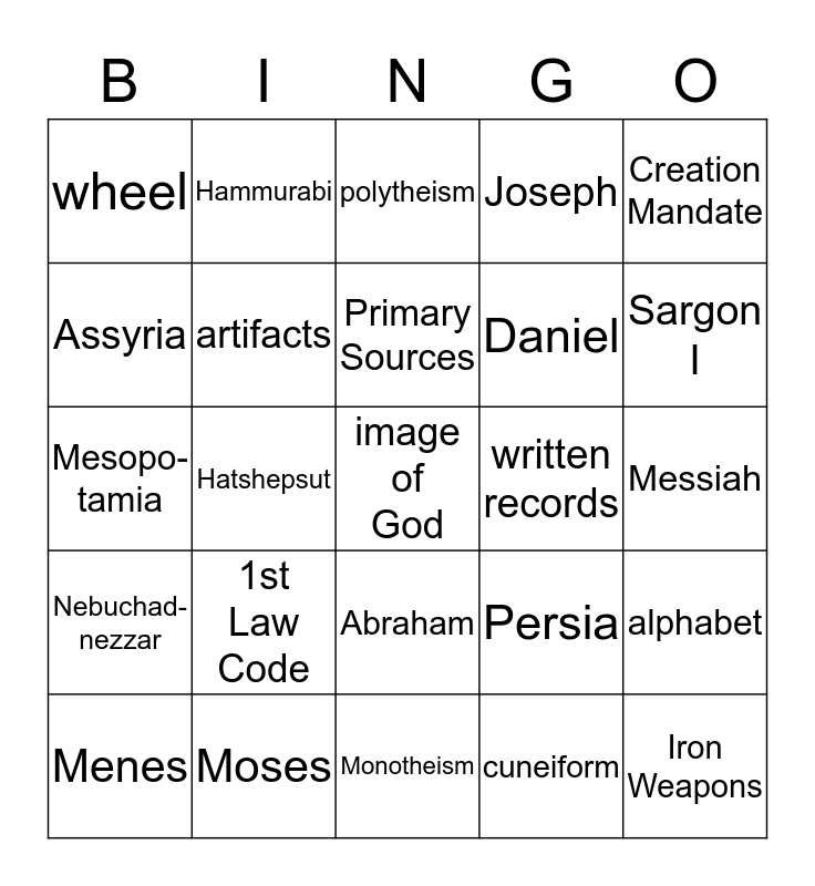 This bingo card has a free space and 24 words: 1st Law Code, Moses, Primary Sources, Menes, Creation Mandate, wheel, Assyria, Hammurabi, written records, Abraham, Daniel, Mesopo- tamia, Persia, alphabet, artifacts, cuneiform, Messiah, polytheism, Sargon I, Hatshepsut, Iron Weapons, Nebuchad- nezzar, Joseph and Monotheism.