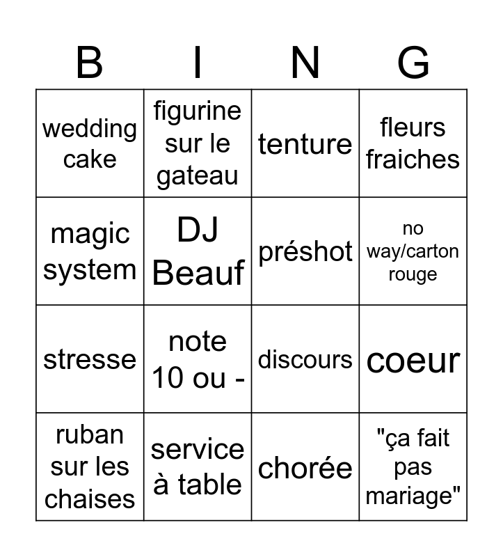 This bingo card has 16 words: service à table, coeur, tenture, wedding cake, stresse, figurine sur le gateau, discours, chorée, magic system, DJ Beauf, ruban sur les chaises, fleurs fraiches, note 10 ou -, no way/carton rouge, préshot and "ça fait pas mariage".