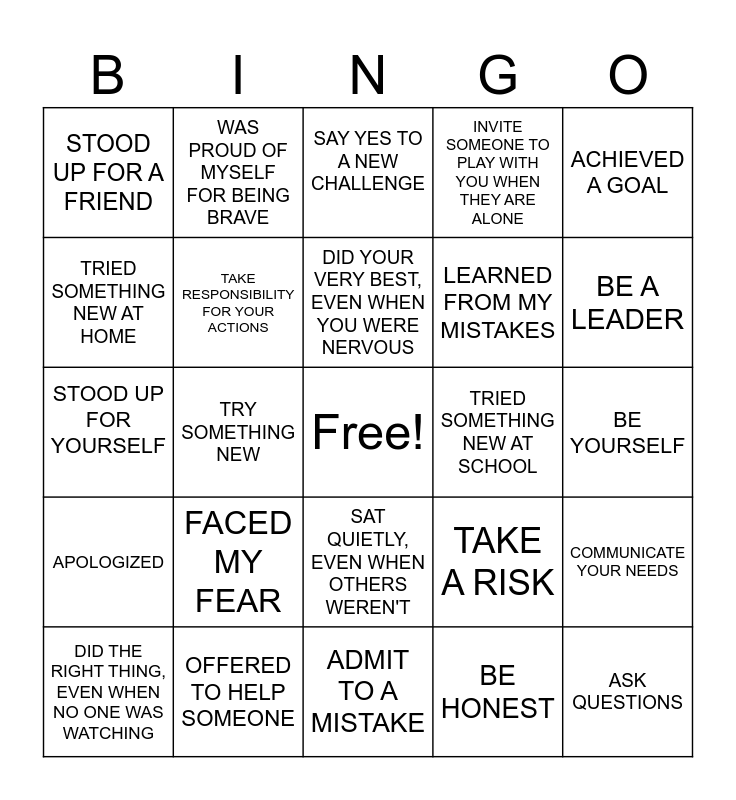 This bingo card has a free space and 24 words: FACED MY FEAR, OFFERED TO HELP SOMEONE, DID YOUR VERY BEST, EVEN WHEN YOU WERE NERVOUS, DID THE RIGHT THING, EVEN WHEN NO ONE WAS WATCHING, ACHIEVED A GOAL, STOOD UP FOR A FRIEND, TRIED SOMETHING NEW AT HOME, WAS PROUD OF MYSELF FOR BEING BRAVE, TRIED SOMETHING NEW AT SCHOOL, SAT QUIETLY, EVEN WHEN OTHERS WEREN'T, LEARNED FROM MY MISTAKES, STOOD UP FOR YOURSELF, TAKE A RISK, COMMUNICATE YOUR NEEDS, TAKE RESPONSIBILITY FOR YOUR ACTIONS, BE HONEST, BE YOURSELF, SAY YES TO A NEW CHALLENGE, BE A LEADER, TRY SOMETHING NEW, ASK QUESTIONS, APOLOGIZED, INVITE SOMEONE TO PLAY WITH YOU WHEN THEY ARE ALONE and ADMIT TO A MISTAKE.