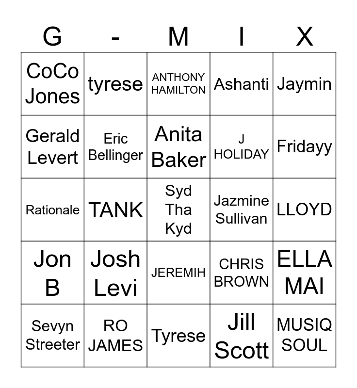 This bingo card has 148 words: SZA, SUMMER WALKER, FANTASIA, JAZMINE SULLIVAN, RO JAMES, CHRIS BROWN, BRYSON TILLER, TYRESE, JILL SCOTT, Erykah Badu, MARY J BLIGE, KEM, JODECI, TEVIN CAMPBELL, SILK, NEYO, Angie Stone, ROBIN THICKE, Giveon, JACQUEES, DANIEL CAESAR, ELLA MAI, H.E.R, ROTIMI, ARI LENNOX, TANK, tyrese, GIVEON, SNOH Aalegra, JHENE AIKO, CHLOE x HALLE, KEVIN ROSS, KHALID, LLOYD, KEYSHIA COLE, K MICHELLE, KELLY ROWLAND, JOHN LEGEND, J HOLIDAY, RIHANNA, KIRKO BANGZ, AUGUST ALSINA, JEREMIH, JOE, JANELLE MONAE, TEYANA TAYLOR, MARIAH CAREY, Tamar Braxton, ASHANTI, Ciara, Keyshia Cole, BEYONCE, Sevyn Streeter, Aaliyah, Jodeci, MONICA, BRANDY, Pru, Ginuwine, Sisqó, ANTHONY HAMILTON, MUSIQ SOUL, Jill Scott, Omarion, Teyana Taylor, Jazmine Sullivan, Jon B, Mariah Carey, Kelly Rowland, Kwn, Jacquees, Muni Long, CoCo Jones, MIGUEL, Lauryn Hill, H.E.R., Major, Jon B., Babyface, Ashanti, Raphael Saadiq, Tevin Campbell, Ne-yo, Ella Mai, Charlie Wilson, Maxwell, Case, Usher, India Arie, Tyrese, Ari Lennox, Gregory Porter, Koffee Brown, AVANT, RO JAMES, TREY SONGZ, Lucy Pearl, jamie foxx, Beyonce, LSG, R. Kelly, Tony Braxton, Gerald Levert, Bruno Mars, Fantasia, Mary J. Blige, Avant, Shai, Blu Cantrell, The Weeknd, 4Batz, Odeal, Savannah Ré, Eric Bellinger, Josh Levi, Ori Shlez, Fridayy, Alex Isley, Syd Tha Kyd, Jaymin, Russ, Rationale, Keith Sweat, Bobby Brown, Anita Baker, Sheena Easton, Karyn White, Shai, Johnny Gill, Tony Rich, Heatwave, Lenny Williams, Billy Paul, Tamia, Aaron Hall, After 7, lizzo, Chris Stapleton, Kali Uchis, Xania Monet, Cleo Sol, PJ Morton, Leon Thomas, Lionel Richie, Meli'sa Morgan, Joe Public, Freddie Jackson and Mya.