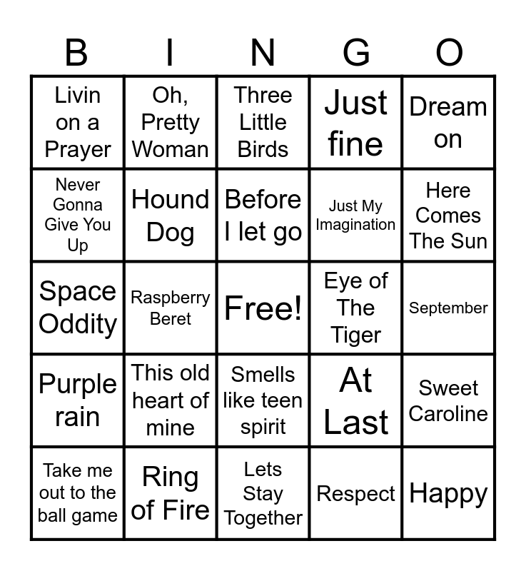 This bingo card has a free space and 39 words: Don't stop believing, My Girl, Bohemian Rhapsody, Hound Dog, Take me out to the ball game, Smells like teen spirit, Before I let go, I love rock n roll, Dream on, Purple rain, Raspberry Beret, Just fine, Happy, September, Eye of The Tiger, This old heart of mine, Girls just want to have fun, Livin on a Prayer, The Way You Make Me Feel, At Last, Never Gonna Give You Up, Lets Stay Together, Just My Imagination, Here Comes The Sun, Sweet Home Alabama, Stand By Me, Aint No Mountain High Enough, Feeling Good, What a Wonderful World, Oh, Pretty Woman, Come Together, Spirit in the Sky, Three Little Birds, Ring of Fire, Respect, The Lion Sleeps Tonight, Sweet Caroline, Space Oddity and Iris.