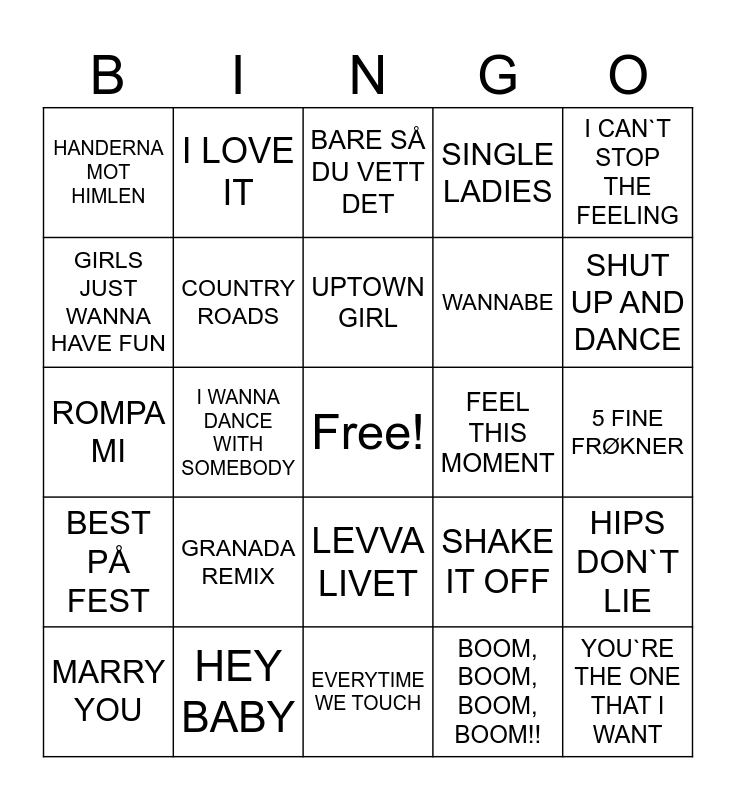 This bingo card has a free space and 33 words: MAMMA MIA, I GOTTA FEELING, I WANNA DANCE WITH SOMEBODY, SWEET CAROLINE, BEST PÅ FEST, COUNTRY ROADS, I CAN`T STOP THE FEELING, MARRY YOU, I LOVE IT, PERFECT, UPTOWN GIRL, BARE SÅ DU VETT DET, FANGA AV EIN STORMVIND, VIVA LA VIDA, FEEL THIS MOMENT, SHUT UP AND DANCE, HEY BABY, ROMPA MI, GRANADA REMIX, SHAKE IT OFF, LEVVA LIVET, I WANT IT THAT WAY, HANDERNA MOT HIMLEN, 5 FINE FRØKNER, EVERYTIME WE TOUCH, YOU`RE THE ONE THAT I WANT, SINGLE LADIES, WANNABE, GIRLS JUST WANNA HAVE FUN, HIPS DON`T LIE, LIFE IS A HIGHWAY, BOOM, BOOM, BOOM, BOOM!! and GLOW.