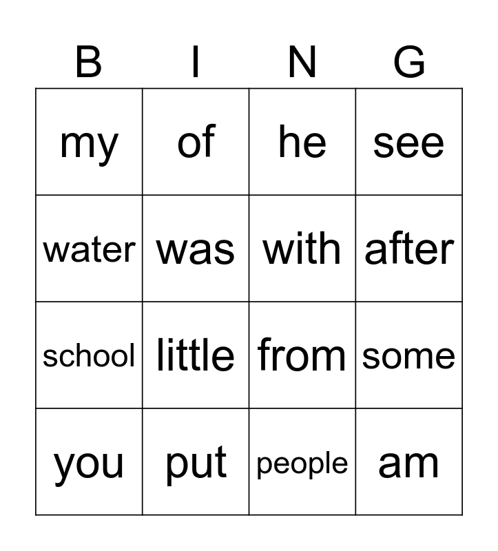 This bingo card has 16 words: put, some, he, my, school, of, from, people, water, was, you, see, little, after, with and am.